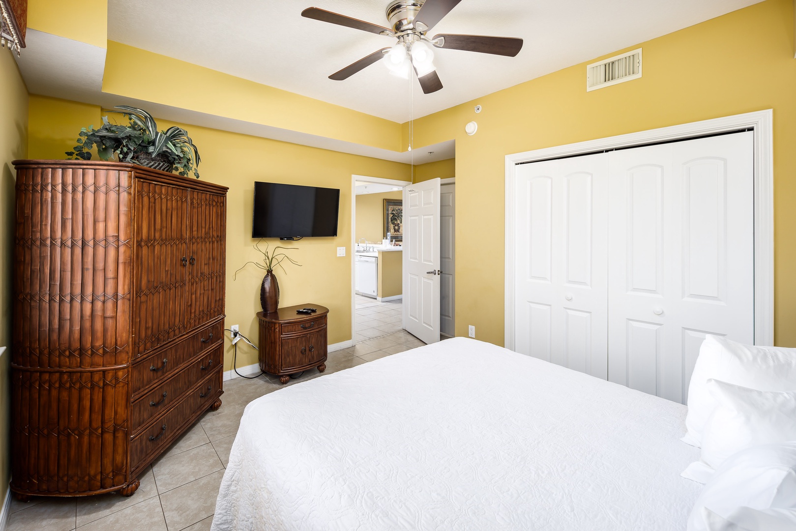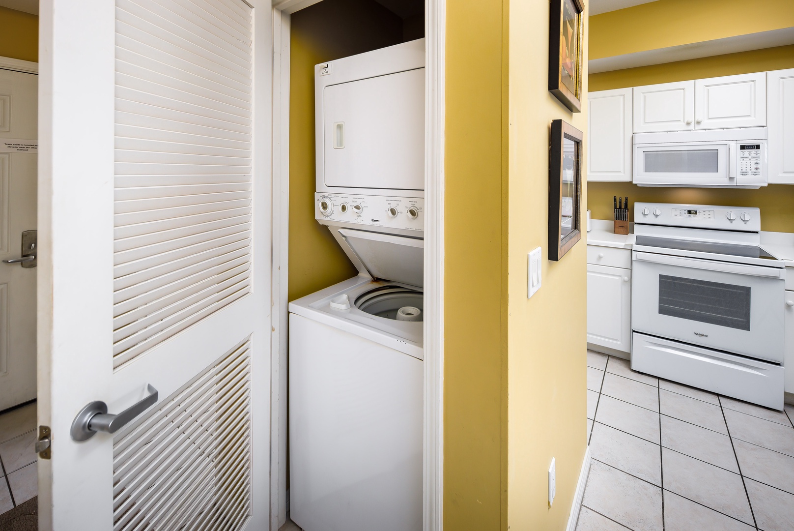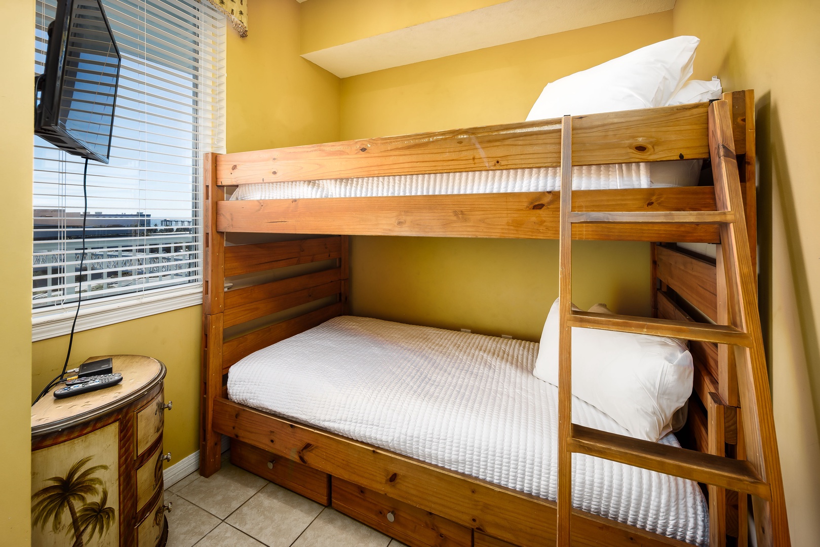 This 3 bedroom/2 bathroom penthouse includes: A fully stocked kitchen with adjoining dining area, a living room with a queen size sleeper sofa for extra guests and black out draperies, and two private balconies. A master suite with a king size bed, private bathroom with standalone shower and large soaking tub, and balcony access. A second bedroom with a queen-size bed and a flat screen TV. A bunk room with twin size bunk beds and a TV (This spot is great for the kids). Washer and dryer in unit.