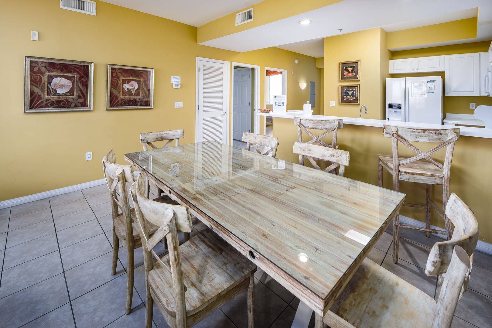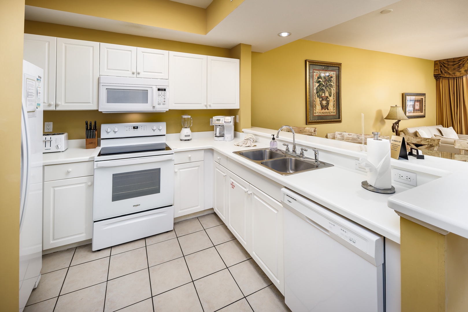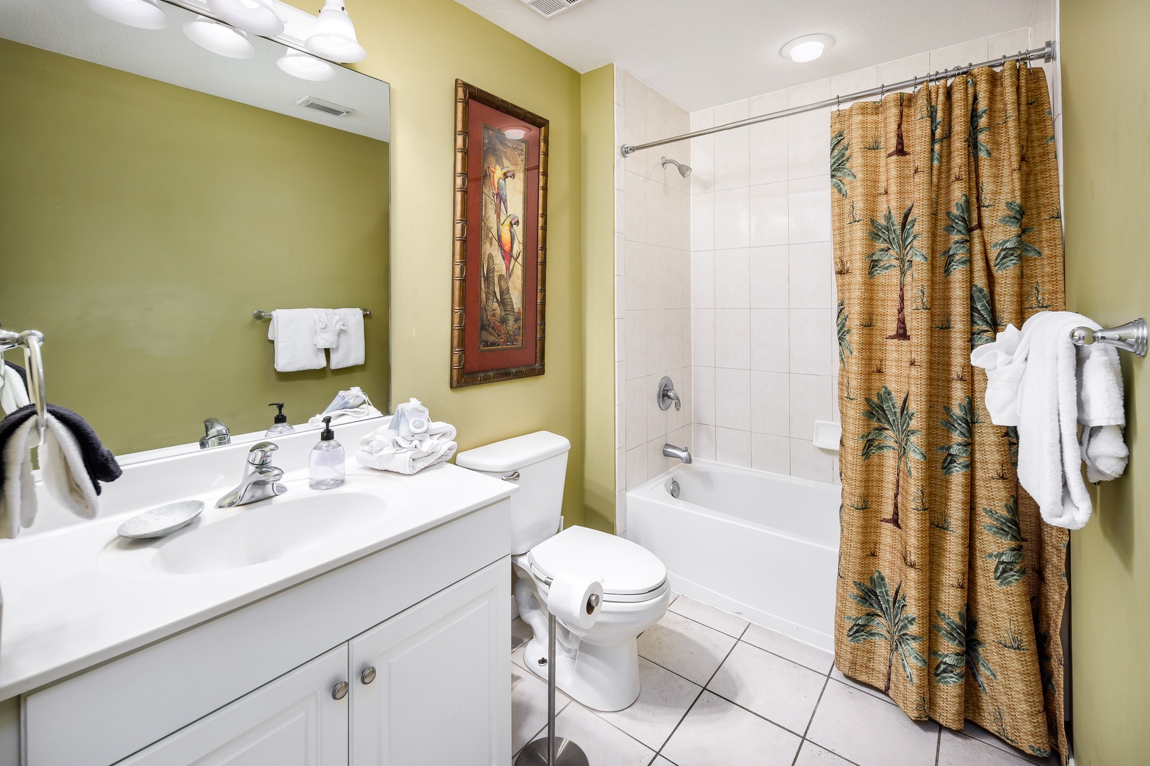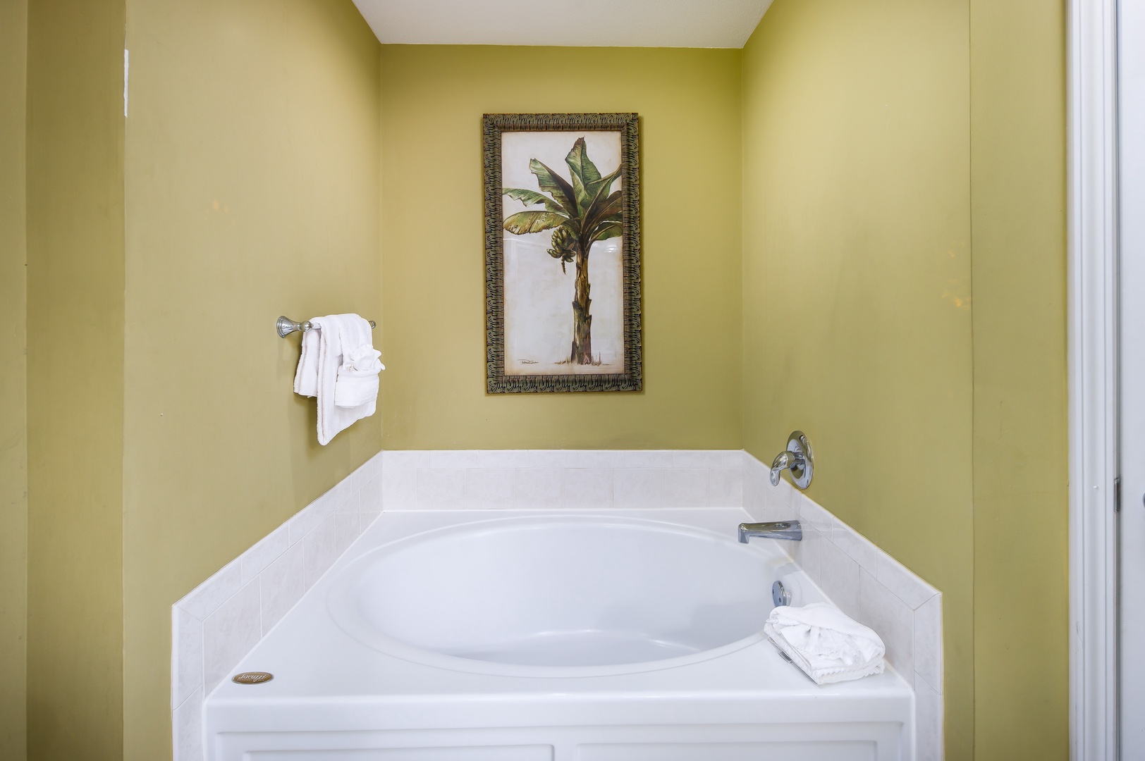This 3 bedroom/2 bathroom penthouse includes: A fully stocked kitchen with adjoining dining area, a living room with a queen size sleeper sofa for extra guests and black out draperies, and two private balconies. A master suite with a king size bed, private bathroom with standalone shower and large soaking tub, and balcony access. A second bedroom with a queen-size bed and a flat screen TV. A bunk room with twin size bunk beds and a TV (This spot is great for the kids). Washer and dryer in unit.